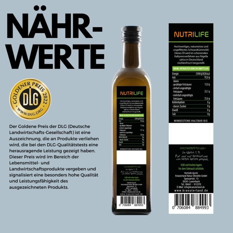 - *Test winner 01/2020 & Golden Award 2018, 2020: Our Nutrilife black cumin oil has been awarded the gold medal 2020 by the DLG for its excellent top quality and taste. In addition, our black cumin oil is price-performance winner on Vergleich.org. Information for the test results can be found on vergleich.org/schwarzkuemmeloel