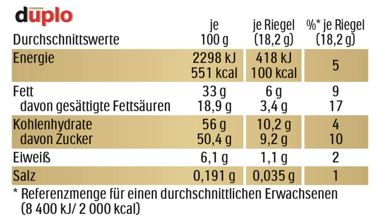 duplo Einzelriegel – knuspriger Schokoriegel mit feiner Nugatcreme, knuspriger Waffel und zarter Vollmilchschokolade – 1 Großpackung mit 40 einzeln verpackten Riegeln (40 x 18,2 g)